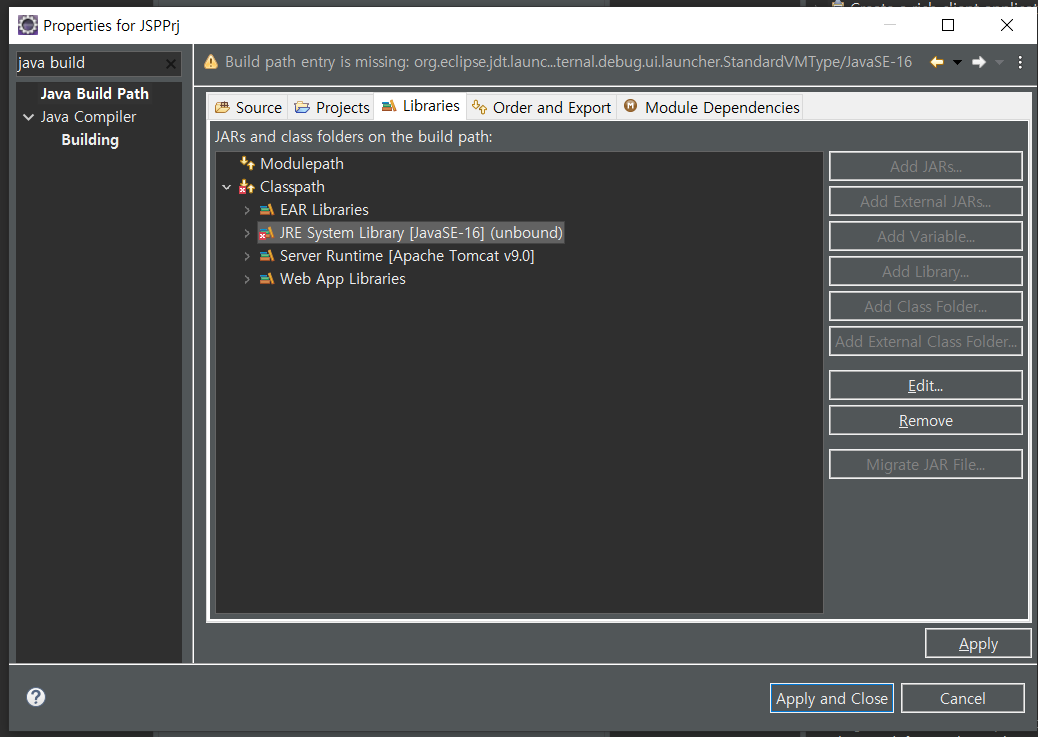 프로젝트 우클릭 -> Properties(알트 엔터) ->java build->상단 Libraries->Add Library->자바jdk8다운 후 ->JavaJDK8 추가 후 -> javaSE-16(unbound) Remove ->Java Build Path Problems, Java Problems 에러 해결