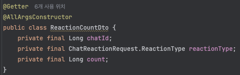 먼저 GROUP BY 로 구룹핑된 쿼리 결과를 받아오기 위해서 DTO를 생성해 주었습니다.