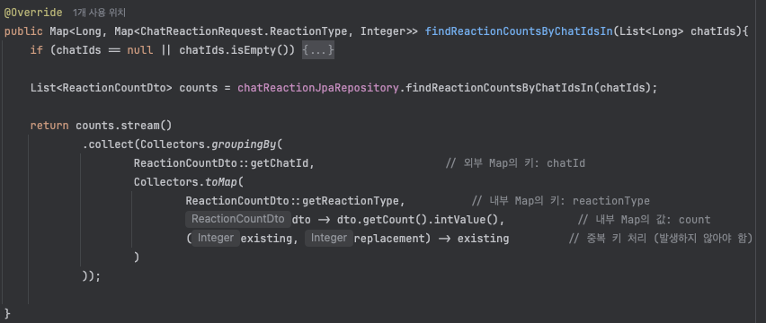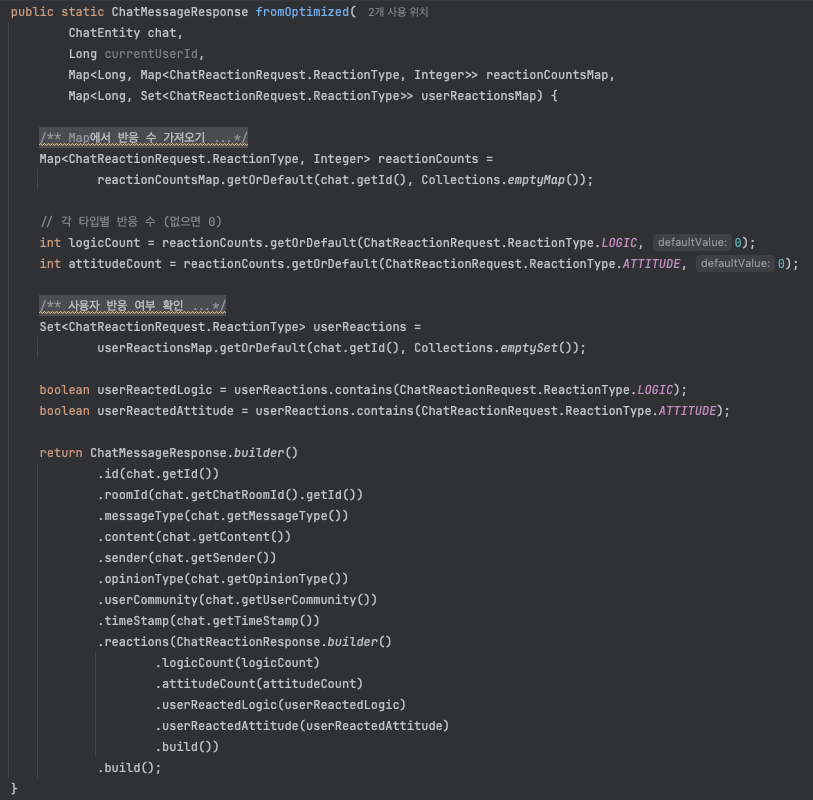 reactionCountsMap.getOrDefault()로 반응 수를 즉시 가져옵니다- 없으면 빈 Map을 반환하여 NullPointerException 방지