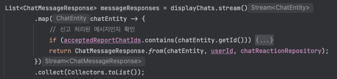아래 코드 첫 번째 스크린샷에서 보시는 것처럼, 조회된 21개의 채팅 메시지 목록(List<ChatEntity>)을 스트림으로 처리하며 각 메시지에 대한 추가 정보를 개별적으로 조회하고 있었습니다.