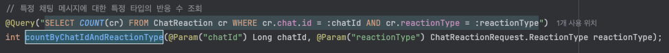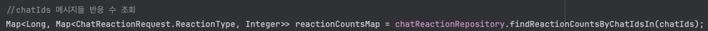 SELECT 문 옆에 new 키워드로 JPQL 생성자 표현식을 사용하여 이전에 만들었던 DTO 를 사용할 수 있도록 하고, 파라미터로 받은 chatIds를 IN절에 넣어 21개 메시지를 한 번에 조회하고, GROUP BY로 채팅 ID와 반응 타입별로 집계합니다.